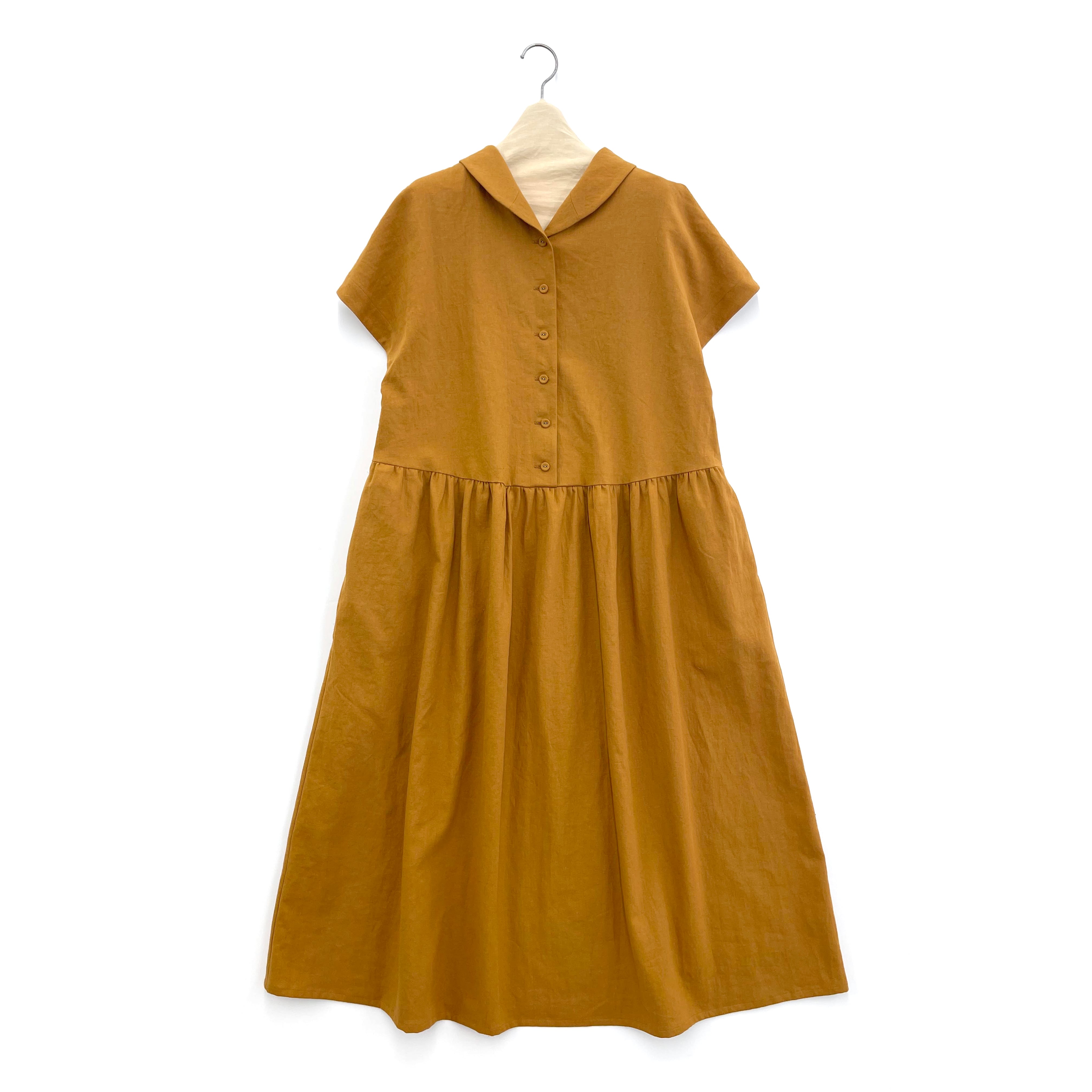 ブロークンツイルで作られたショールカラーワンピースは、日常使いから特別な日まで幅広く活躍します。綿麻素材の特性を生かし、軽やかで快適な着心地が魅力です。ローウェストで切り替えたギャザーは可愛くなりすぎず大人な印象があります。