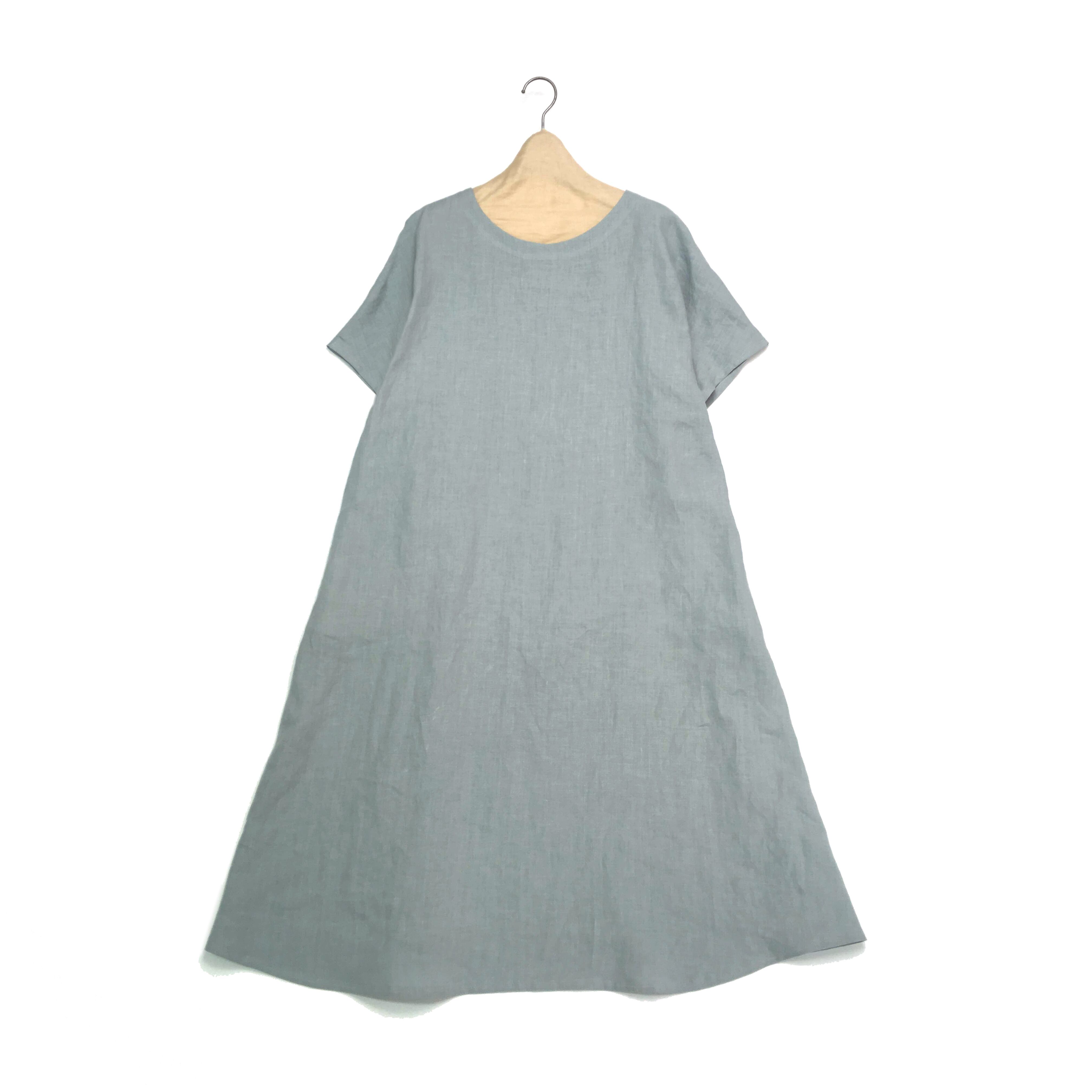 ジャパンリネン半袖ワンピース【サックスブルー】